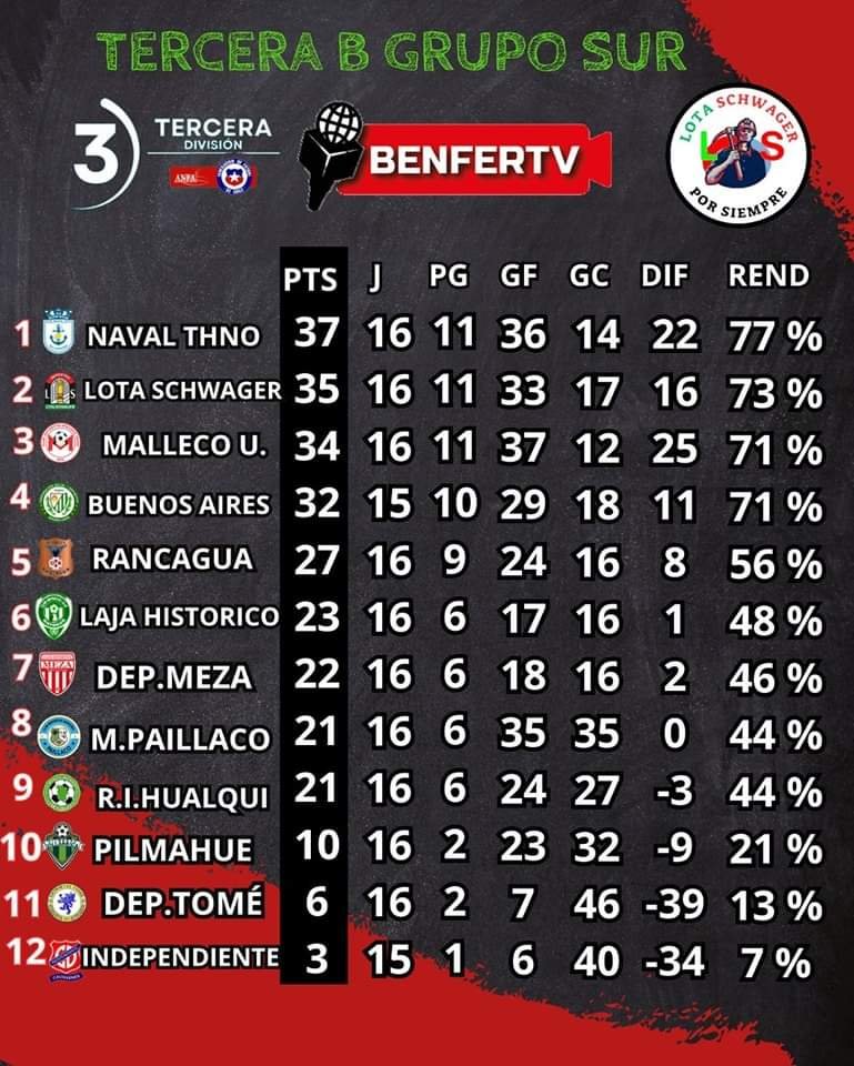 Lota Schwager venció a Laja Histórico como visitante por 2-0 y aprovechó el triunfo de los de Nahuelbuta y quedando a dos unidades de Naval, teniendo que jugar entre sí la última fecha.