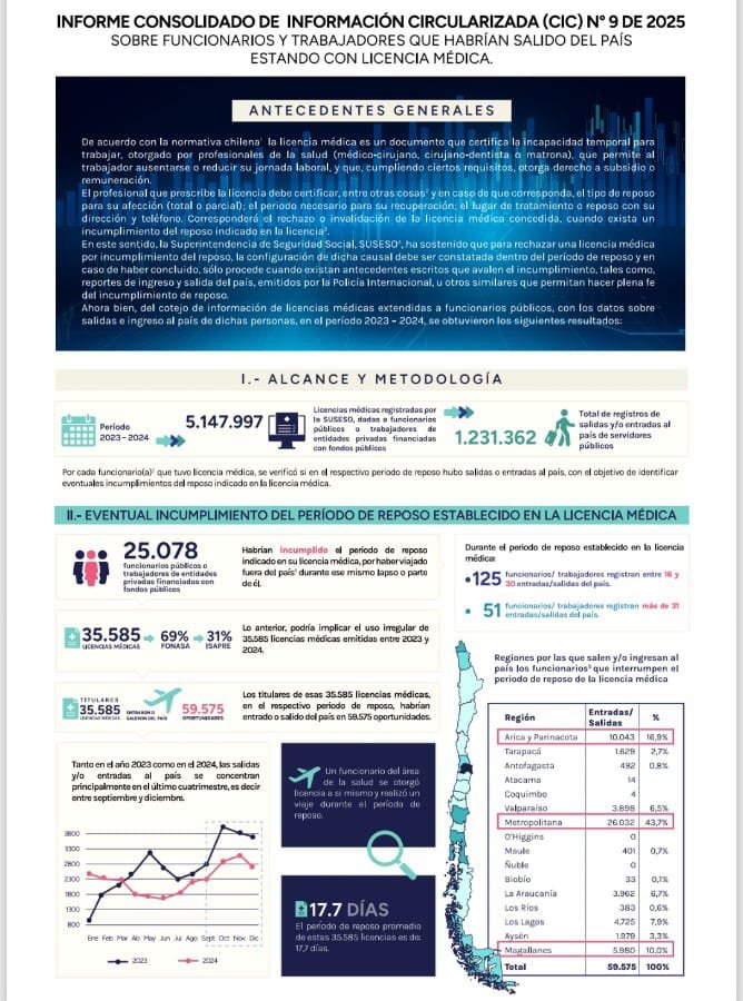 De acuerdo con el noveno Consolidado de Información Circularizada (CIC), entre 2023 y 2024, 25.078 funcionarios públicos o de entidades que cumplen esa función a nivel nacional habrían incumplido el periodo de reposo indicado en su licencia médica, por haber viajado fuera del país durante ese mismo lapso o parte de él.