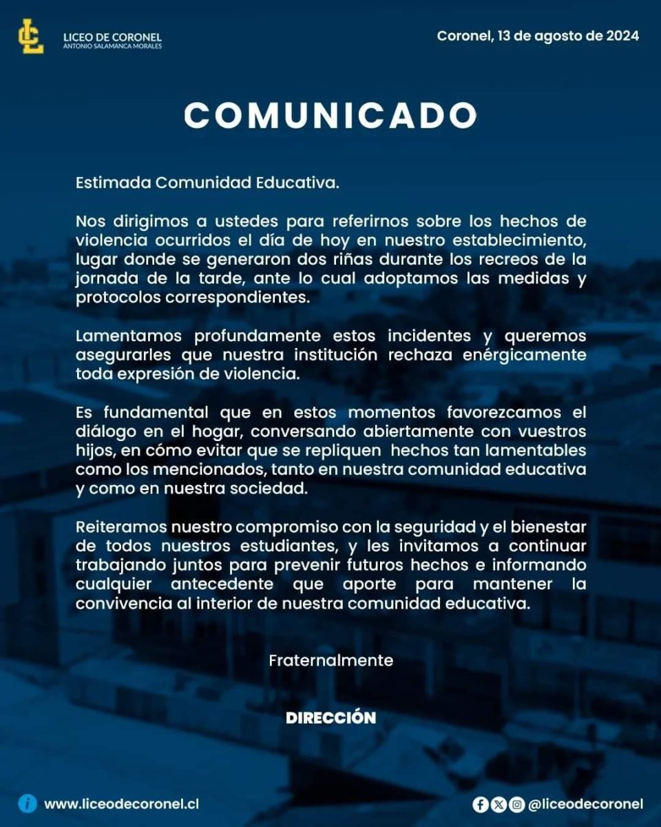 El Liceo de Coronel emitió un comunicado a través de sus redes sociales en donde dan cuenta de dos riñas ocurridos en el establecimiento en momentos de recreo en la jornada de la tarde. El establecimiento adopto las medidas y protocolos correspondientes