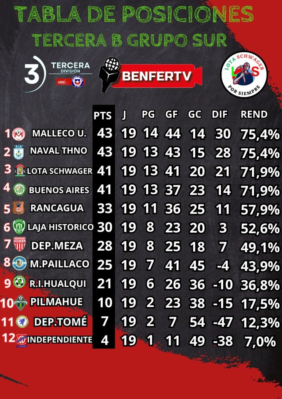 Naval de Talcahuano se hizo un festín ante Deportes Tomé y también alcanzó los 43 puntos junto a Malleco. El 6-0 contra el Monstruo de la bahía los ayudó en la diferencia de gol.